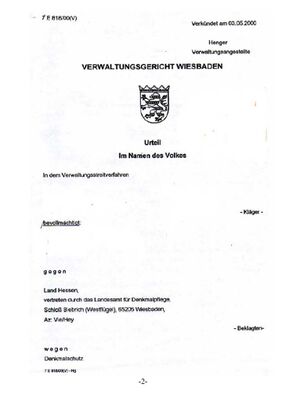 Das Verwaltungsgericht Wiesbaden stellte auch fest, dass auch dem Kläger Grundrechtspositionen zur Seite stehen. 'Dies bezieht sich nicht nur auf die allgemeine Handlungsfreiheit nach Art. 2 Abs. 1 GG, sondern auch auf die Freiheit von Wissenschaft und Forschung nach Art. 5 Abs. 3 GG. Es wäre eine unzulässige Verkürzung eines demokratischen Grundrechtsverständnisses, wenn die Wissenschafts- und Forschungsfreiheit nur habilitierten Professoren oder promovierten Kunsthistorikern zur Seite stünde. Auch ein Geschichtsforschungsverein aus Privatleuten darf sich auf dieses Grundrecht berufen, auch wenn diese keine fachwissenschaftliche Ausbildung haben, wie Mitarbeiter des Landesamtes für Denkmalpflege.'[9]